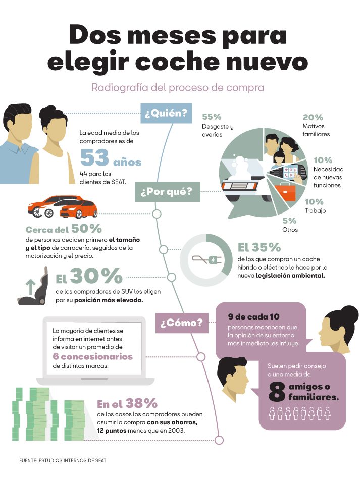 – Ocho semanas y media: es lo que suele alargarse el proceso de la compra. La primera decisión que se toma es el tamaño y el tipo de carrocería. El 45% de los compradores empieza fijando este criterio. Un 24% de los clientes decide primero el tipo de motor (diésel, gasolina o híbrido) mientras que un 17% lo primero que tiene claro es el presupuesto y un 14%, la marca. En este sentido, según Enrique Pastor, responsable de Investigación de Mercados y Estrategia de Producto de SEAT, el 55% de los futuros compradores que opta por una marca cambia de preferencia a lo largo del proceso.