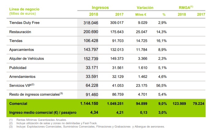 A nivel unitario, el ratio de ingresos comerciales por pasajero se situó en 4,34 euros, un 3% superior al del mismo periodo de 2017 (4,21 euros). En esta ratio se engloban los ingresos de las actividades comerciales dentro del terminal y los procedentes de los aparcamientos, excluyendo los ingresos por servicios inmobiliarios que forman un segmento de negocio diferenciado.