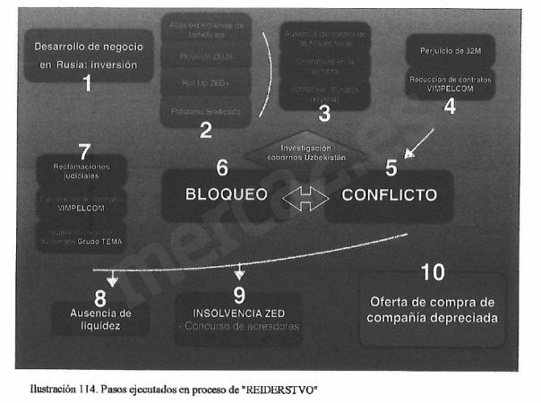 Según los accionistas existen “indicios más que razonables” para asegurar que la caída del valor de DIA y sus problemas internos fueron provocados por los denunciados –principalmente Fridman–. Premisas que se basan en las conclusiones del informe policial (recogidas en las ilustraciones) en el que se revela que el magnate ruso montó toda una red criminal conocida como “reiderstvo”, es decir, asalto o absorción ilegal de una empresa, que, además, diseñó para dar apariencia legítima a la ilegalidad utilizando prácticas delictivas como fraude, obstrucción a la justicia, coacciones y amenazas, entre otros.