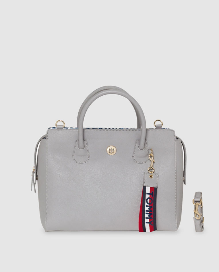 Este bolso de mano en color plata tiene un broche grabado metálico de la marca y llavero charm Tommy Hilfiger en un lateral. Además, cuenta con dos asas cortas, asa larga extraíble y cierre de cremallera.