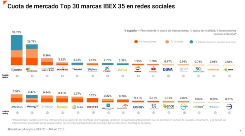 El informe Panel Epsilon Icarus Analytics concluye que las 10 compañías del Ibex 35 que mayor relevancia tuvieron en redes sociales el año pasado fueron: Acciona, Iberdrola, Mediaset España, Mapfre, Banc Sabadell, Telefónica, CaixaBank, Bankia, Repsol y Santander.