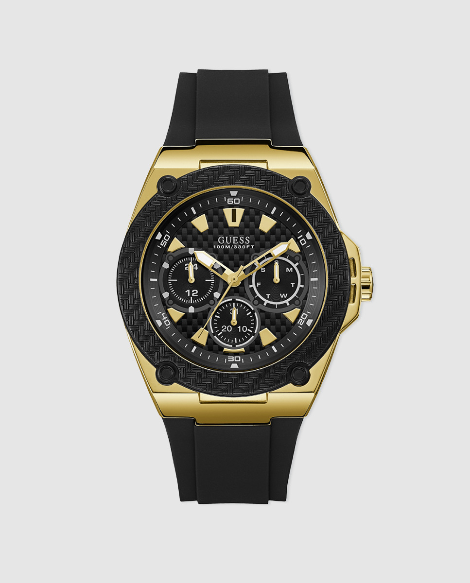 El reloj es un regalo clásico que siempre gusta. Especialmente si es un reloj de la marca GUESS. Este reloj multifunción con caja de acero inoxidable PVD de oro amarillo, con esfera y bisel negros y con índices dorados y correa de silicona, puede ser el regalo perfecto para él si le gusta controlar el tiempo.