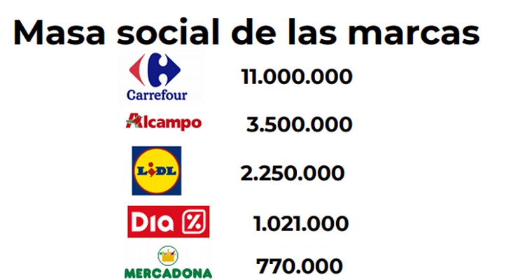 En la lista, también se pueden ver otros supermercados como Alcampo, quien tiene 3,5 millones de seguidores y está en segundo puesto, y DIA, quién está en cuarto puesto con 1 millón de seguidores. La gran presencia en Facebook de Carrefour le ha dado la victoria. En cambio, Mercadona ha pagado el participar poco en esta red social, pues tiene muchos más seguidores que twitter. Alcampo ha logrado estar ahí la segunda, debido a que es la que más publicaciones realiza, aunque es de las menos eficaces si hacemos la media entre publicaciones e interacciones recibidas.