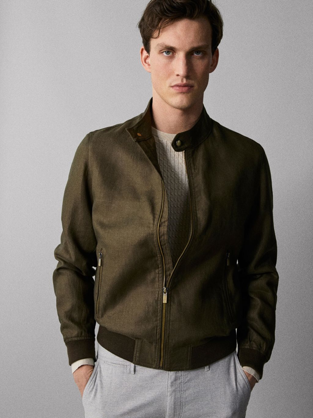 Cazadora estilo bomber, confeccionada en tejido 100% lino. Corte recto, cuello con tira abotonada por snap y cierre mediante cremallera. Dos bolsillos laterales de cremallera, manga larga terminada en puño elástico, bajo elástico, aplique decorativo, forro y varios bolsillos interiores.