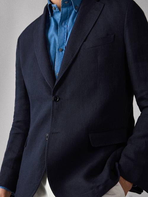 Americana azul marino, confeccionada en tejido sarga 100% lino. Corte slim, cuello con solapas de muesca y ojal, y cierre de dos botones. Dos bolsillos laterales con solapa, un bolsillo insertado a la altura del pecho, manga larga terminada en puño de cuatro botones, dos aberturas en la parte posterior, forro y varios bolsillos interiores
