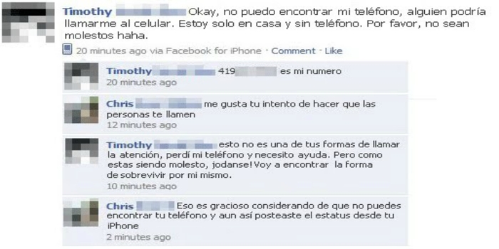 Pero poco duró esta estrategia de Timothy ya que un conocido de Facebook delató que había hecho la publicación a través de su iPhone (vemos el icono en el mensaje principal también), por lo que Timothy se quedó sin llamada y sin excusas para que alguien le diera un toque.