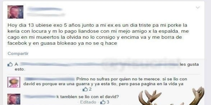 El caso es que a veces se descubre más de lo que se quiere, como es el caso que vemos aquí. Este chico se queja de que su ex pareja se lió con su mejor amigo, pero lo gracioso es que parece que no fue con el único con el que se lió. Un tal David también aprovechó la oportunidad. Vamos, que este chico tenía más cuernos que un ciervo, o eso es lo que parece.