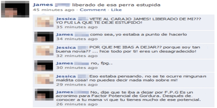 Aunque parezca una broma de mal gusto, parece que no lo es. James publicó en su muro de Facebook su ruptura con su ex pareja (suponemos que creía que la había eliminado por completo, pero que no fue así), alegando que fue él quien se libro de ella. La sorpresa nos la llevamos cuando Jessica, su ex novia, decide contestarle.