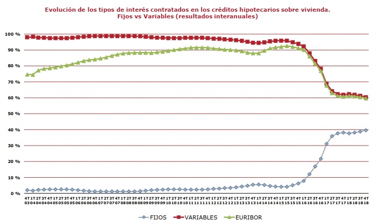 Esta tendencia comenzó a verse en 2017. Un año después, las hipotecas a plazo fijo representaron en 39,59% de los nuevos créditos hipotecarios, un crecimiento más de un punto porcentual con respecto a 2017, según el Anuario de la Estadística Registral Inmobiliaria (ERI) que ha publicado recientemente el Colegio de Registradores.