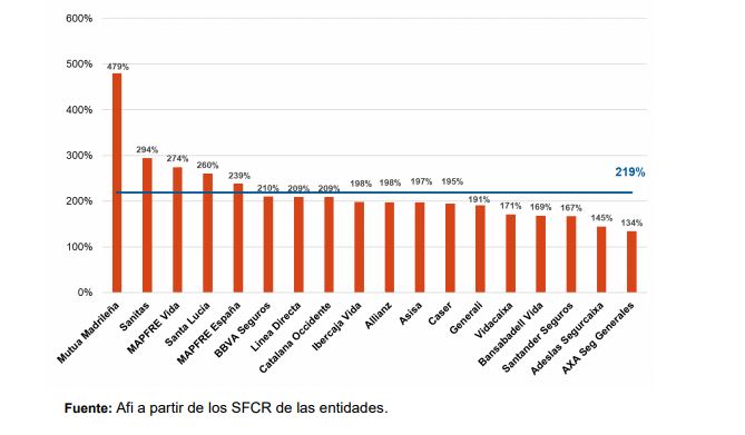¿La media de ratio de solvencia? 241%. Eso sí, si tenemos en consideración algunas ‘medidas especiales’ a las que pueden acogerse las entidades (y que algunas han optado por no acogerse a ellas), dicho porcentaje se quedaría en el 219%. Es decir, que las entidades aseguradoras disponen de un capital que está por encima del más del doble legalmente exigido. Incluso hay casos, como el de Mutua Madrileña, que lo multiplica por cuatro. “Las diferencias entre compañías se deben a las diversas tipologías de compañías o modelos de negocio”, matizan desde Afi.