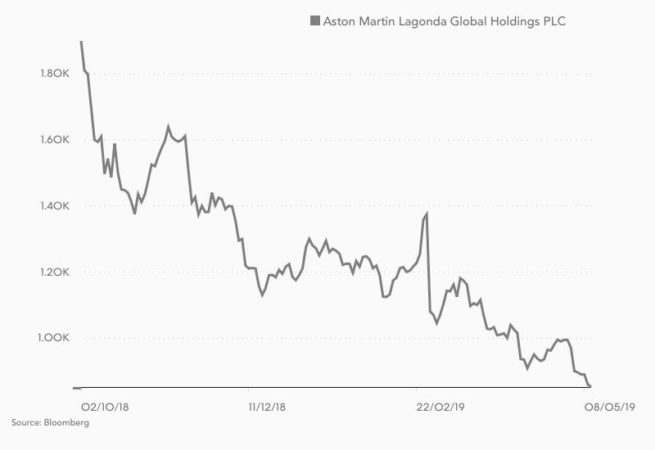 Ocho meses han bastado para que la cotización de Aston Martin en el parqué londinense se derrumbe un 55%% desde el 3 de octubre de 2018, sesión de su estreno en bolsa. Desde las 19 libras iniciales, que estimaban un valor de la compañía en 4.330 millones de libras (3.753,62 millones de euros al cambio de ese momento), ha pasado a menos de la mitad.