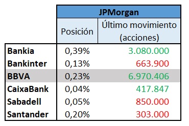 Ese mismo día, JPMorgan tuvo una gran actividad bursátil en el sector financiero, tanto para compras como para ventas. Además de en BBVA, aumentó su posición en Bankia (+3,08 millones de acciones) y CaixaBank (+417.847 acciones), según los datos recogidos por Bloomberg. En el lado de las ventas, Sabadell (-850.000 acciones) y Santander (-303.000 acciones). Dos meses antes había realizado una fuerte desinversión en Bankinter, casi el 50%, al deshacerse de 663.900 títulos de la entidad dirigida por María Dolores Dancausa.