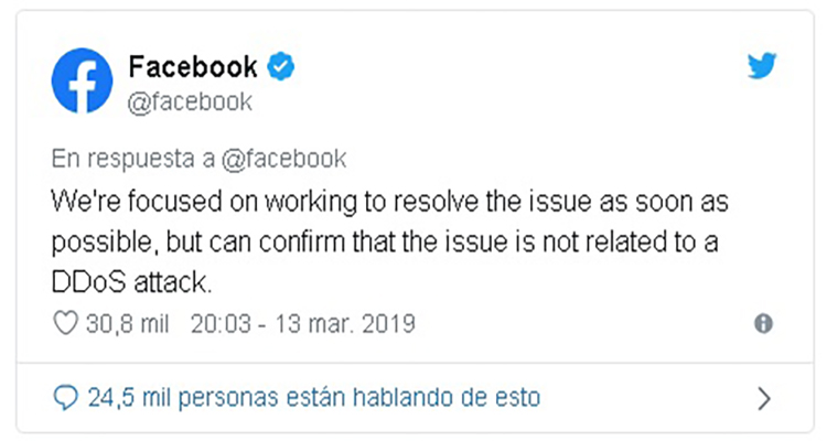 El pasado 14 de marzo los usuarios apoyaron la teoría de un ataque DDoS, aunque la compañía lo desmintió. Se trata de un ataque hacker que bloquea el acceso de los internautas y que afecta a grandes plataformas. Muchos internautas aseguraron que Facebook estaba siendo atacado. Algunos incluso dijeron tener pruebas que lo demostraban, aunque nunca se confirmó. Otra teoría apoyaba la posibilidad de una “sobrecarga” en la base de datos de Facebook, tal y como indicó un periodista del canal NBC en Twitter. Sin embargo, ninguna de las dos teorías fue aceptada oficialmente por la empresa de Zuckerberg, que relacionó el “apagón” con una actualización del servicio.