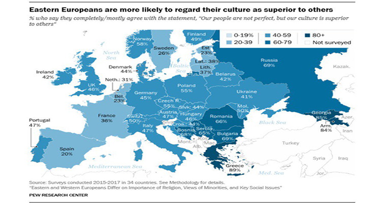 En comparación, el 45% de los participantes encuestados en Alemania, Reino Unido e Italia aseguraron sentirse superiores a la mayoría. Para ellos, su cultura lo es todo y están seguros de su superioridad y evolución cultural. Aunque hay ejemplos más significativos en el este de Europa, donde Bosnia, Servia, Bulgaria y Rumania superan el 65%.