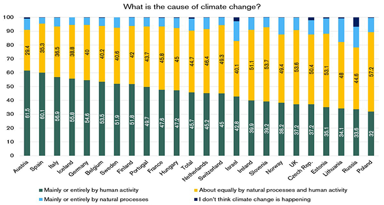 Según las encuestas, España tiene muy claro quién es el causante del cambio climático. Es muy complicado separar el factor humano de los cambios que se vienen sucediendo en el planeta, y los españoles lo saben. No tenemos ningún reparo en reconocerlo, y por ello, aparecemos los segundos en este esquema comparativo con un 60,1% de apoyo.