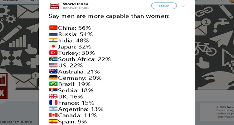 Aún a día de hoy hay países en el mundo donde más de la mitad de los encuestados piensan que el hombre está más capacitado que la mujer para trabajar, ganar un sueldo y educarse. Cuando Ipsos realizó su encuesta en 2017 coronó a España en una posición de honor. En comparación con otros países, somos ejemplo del cambio de conciencia social que se está experimentando desde hace décadas.