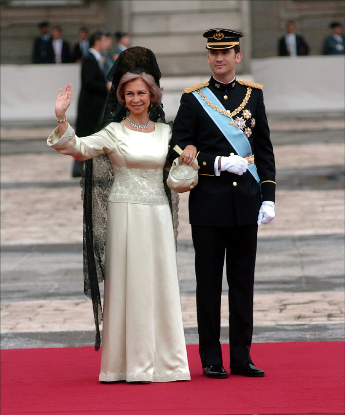 Doña Sofía llevaba un elegante vestido largo de Margarita Nuez y la tradicional mantilla española adornada con una gargantilla y pendientes de esmeraldas y brillantes, mientras que el entonces Príncipe de Asturias vestía el uniforme de gran etiqueta de comandante del Ejército de Tierra y llevaba el Collar de la Orden del Toisón de Oro, la Gran Cruz del Collar de la Orden de Carlos III y las Grandes Cruces del Mérito Militar, Naval y Aeronáutico