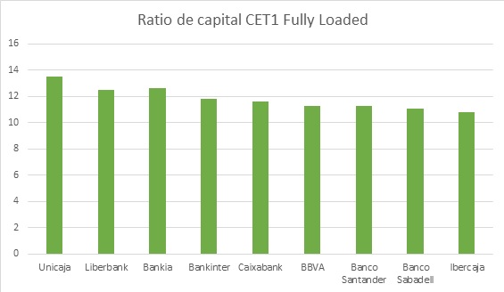 En el caso de Ibercaja, el punto de referencia es el 10,8% de capital Cet 1 Fully Loaded (que es como se conoce al capital de máxima seguridad que registra un banco en su balance que es ya de uso obligatorio por el BCE). La cifra que ha mejorado notablemente desde diciembre, subió en 25 puntos básicos, sigue por detrás de los niveles publicados por el resto de entidades cotizadas a 30 de marzo: Bankia (12,61%), Bankinter (11,8%), Caixabank (11,6%), BBVA (11,3%), Banco Santander (11,25%), Banco Sabadell (11,1%) aunque deberá registrar las ventas de activos que ha realizado en los últimos meses, y mientras los más pequeños, Unicaja y Liberbank, mantienen todavía niveles más altos de capital.