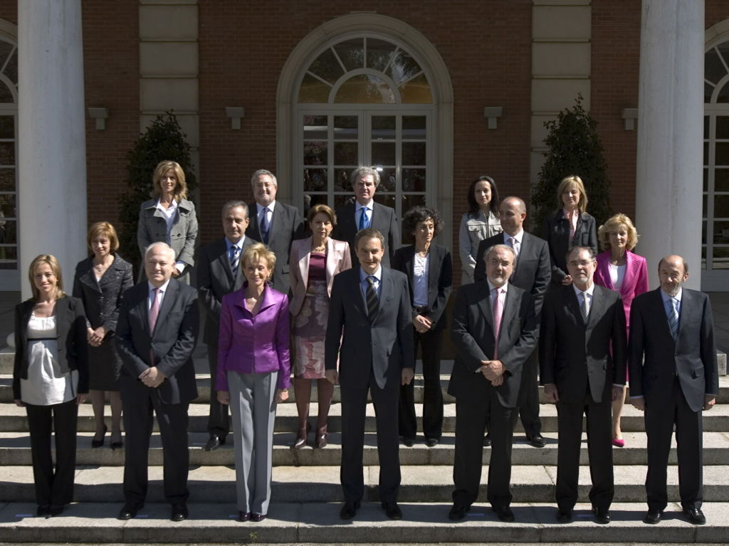 José Luis Rodríguez Zapatero con el equipo de ministros elegido para su segundo mandato tras vencer en las elecciones generales de 2008. Alfredo Pérez Rubalcaba compaginaría Interior con Defensa durante la baja por maternidad de Carme Chacón y a partir de 2010, con la Vicepresidencia Primera del Gobierno y la Portavocía.
