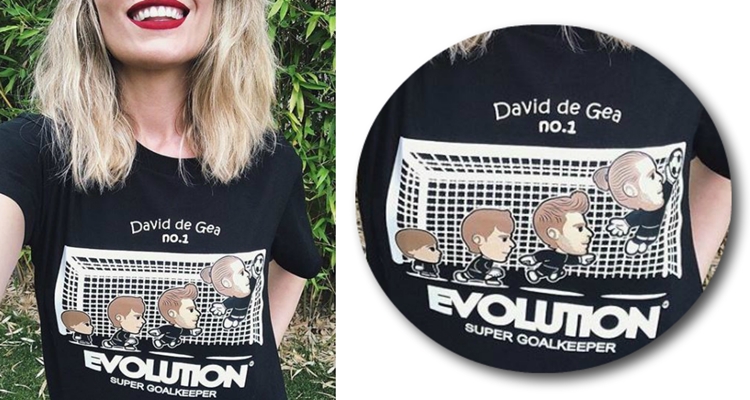 Edurne lucía una camiseta en la que se ve cuatro muñecos de De Gea y la evolución que habría experimentado desde que le conocimos. Todo ello acompañado de la leyenda ‘super goalkeeaper’ -‘súper portero’, en la que los usuarios de la red social le echan en cara que ‘el amor es ciego’ y que por eso no es capaz de valorar, de manera justa, que el portero estaba siendo de lo menos lucido del conjunto en el pasado Mundial de Rusia.