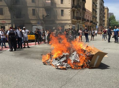 La concentración ha empezado sin incidentes y cerca de las 13.00 horas algunos ‘riders’ han prendido fuego a una de las mochilas de la compañía en el cruce entre las calles Pujades y Àlaba, por lo que ambas han quedado cortadas.