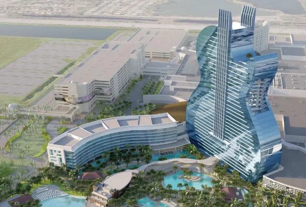 El ambicioso proyecto de Hard Rock está cerca de ver la luz. La compañía ha anunciado el nuevo hotel en Hollywood, Florida (EEUU), abrirá sus puertas el próximo 24 de octubre. Con 638 habitaciones, la peculiaridad es su forma, que imita a la de una guitarra gigantesca, revestida en cristal y acero con luces que simularán las cuerdas del instrumento.