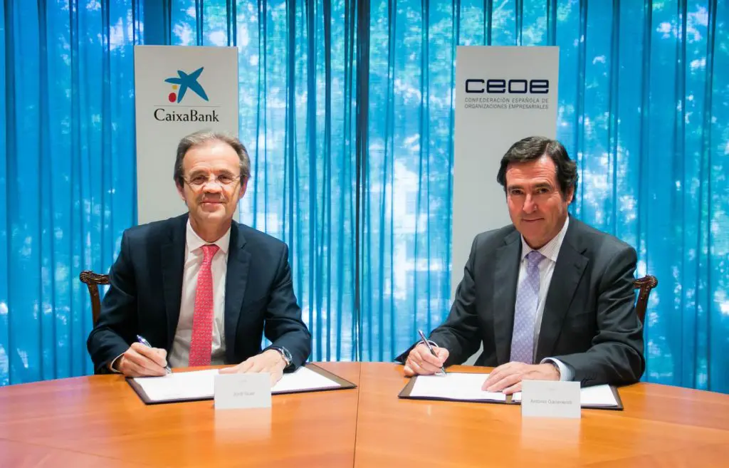 El convenio ha sido firmado esta tarde por el presidente de CaixaBank, Jordi Gual, y el presidente de CEOE, Antonio Garamendi. Gual ha subrayado el papel de la entidad financiera en los últimos años para impulsar segmento de banca de empresas, «esencial» para mejorar la competitividad de la economía española y acceder a nuevos mercados nacionales e internacionales.