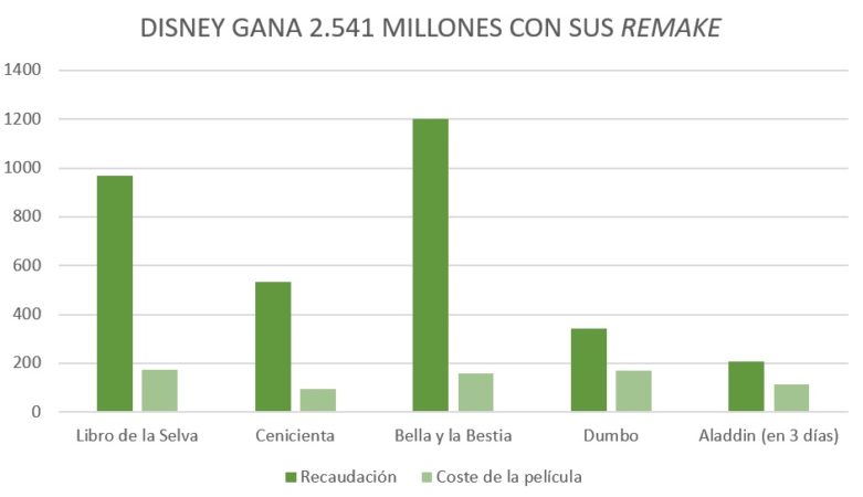 La idea parece sencilla, pero el resultado no ha podido ser mejor, y es que Disney ya ha ingresado más de 3.250 millones de dólares (unos 2.900 millones de euros) gracias al remake en carne y hueso de cinco de sus grandes clásicos animados. Aunque si la cifra impresiona, más lo hace todavía la cantidad ‘limpia’ (ingresos menos costes) que ha cosechado: 2.541 millones de dólares (2.235 millones de euros) y un retorno sobre el capital invertido del 356%.