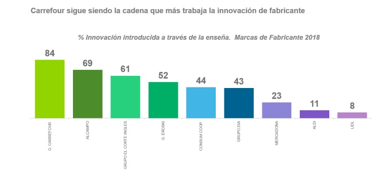 Por el contrario, existen cadenas que pueden servir de ejemplo de compromiso por la innovación, con unos niveles altos de introducción de nuevos productos en sus lineales como Carrefour (84%), Alcampo (69%), El Corte Inglés (61%) y Eroski (52%).
