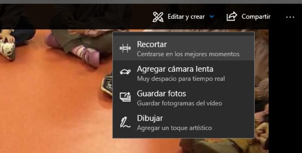 - Recortar vídeos: si deseas cortar algún vídeo y eliminar partes de él, lo mejor es que hagas clic con el botón derecho sobre el archívo de vídeo y luego pulses en Abrir con… para seleccionar la herramienta Fotos. Una vez abierta, pulsa en el botón Editar y crear y luego en Recortar. Finalmente, usa la barra temporal para marcar el trozo que quieres conservar acotando el inicio y fin del vídeo. Ya solo necesitas pulsar en Guardar una copia.