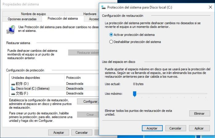 Crear punto de restauración en Windows 10