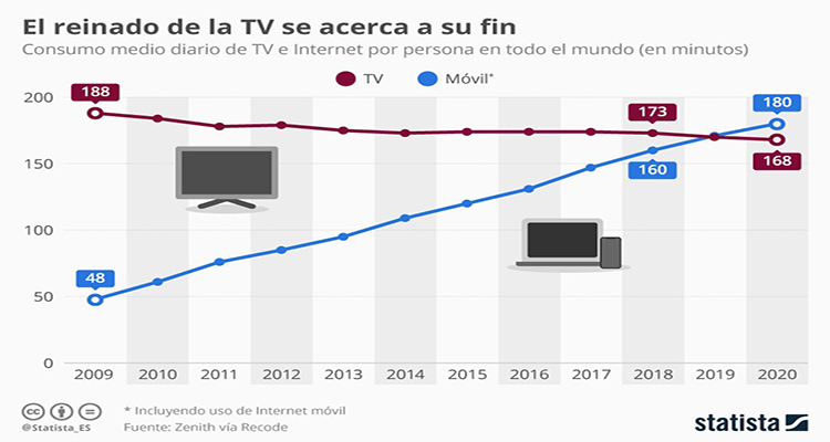 Año tras año cambian los tiempos y los usos de los espectadores a nivel mundial, siempre a favor de Internet. La televisión se mantiene con firmeza mientras ve decaer muy lentamente su tiempo de encendido. En comparación, el tiempo de uso de Internet crece cada año de manera más radical. Se espera que a lo largo de los años 2019 – 2020 se produzca el gran cambio en las estadísticas.