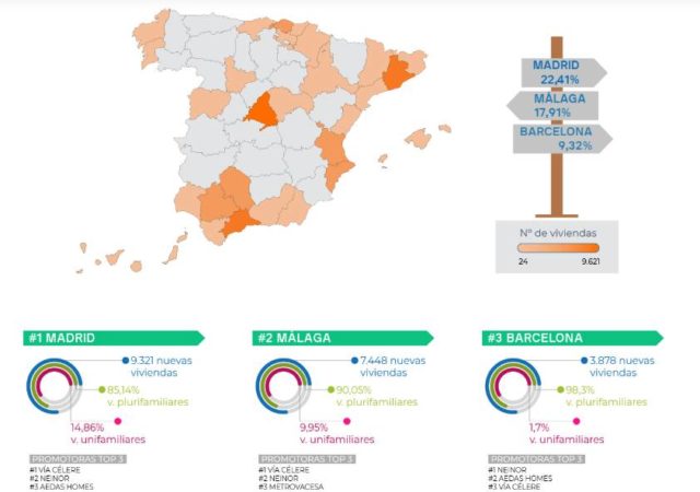La Ciudad Condal pierde su condición de segunda ciudad con mayor obra nueva en el sector residencial. Ahora es Málaga quien ostenta este título honorífico. Sólo en Madrid se construyen más viviendas que en la ciudad andaluza. Entre las tres ciudades suman más de la mitad de obra nueva en España. Vía Célere, Neinor y Aedas reinan a nivel nacional.