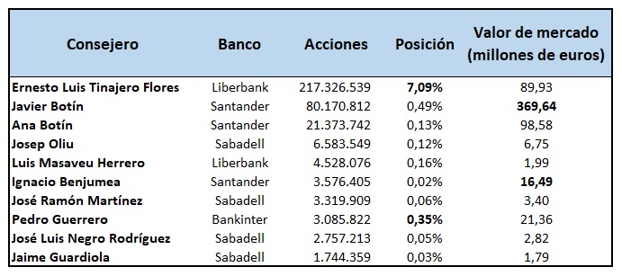 Los diez consejeros con más acciones de sus bancos se reparten en solo la mitad de las entidades: Bankinter, Liberbank, Sabadell y Santander. En Bankia, BBVA y CaixaBank no hay ni un miembro del consejo con más de un millón de acciones (solo se acerca Gonzalo Gortázar con 860.000 títulos). No obstante, la palma se la llevan los de Unicaja. De las doce personas que forman el consejo, ninguna es accionista del banco andaluz.