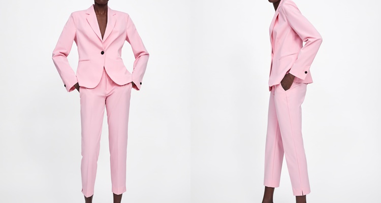 Este traje rosa de Zara es perfecto para dar un aspecto más alegre y veraniego a los looks de oficina. El pantalón está rebajado a 12,99 euros y el blazer cuesta 19,99 euros. Los pantalones son tobilleros para resultar más frescos, y la chaqueta también es corta y ligera y se ata con un solo botón.