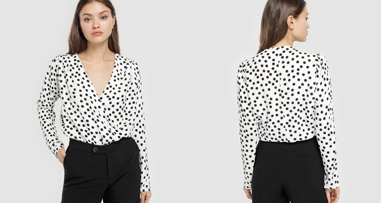 Los lunares son plena tendencia y este body de lunares en blanco y negro es ideal para todo tipo de looks, desde los más elegantes a los más informales. Una blusa del departamento de Fórmula Joven de El Corte Inglés que pasa de 35,99 euros a 15,99 euros. Queda ideal con pantalones negros o con una falda vaquera.