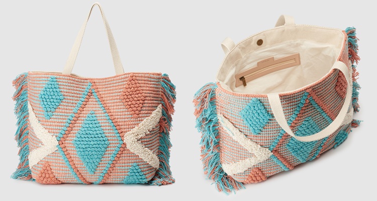 Este bolso grande es perfecto para llevar a la playa y también fuera de ella. Es un bolso tipo shopper en naranja y azul de Jo & Mr. Joe a la venta en El Corte Ingles por 27,90 euros. Los flecos laterales y los detalles de pasamantería lo hacen un bolso muy veraniego.