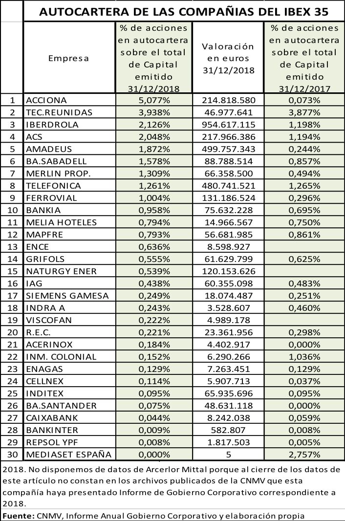 A lo largo de 2018 seis de las compañías con autocartera del Ibex 35 realizaron amortizaciones de acciones propias. Estas sociedades fueron: ACS, Ferrovial, Iberdrola, IAG, Mediaset España y Repsol. Ya en 2019 (hasta el mes de mayo) Iberdrola, Mediaset España, Acerinox, Bankia y Naturgy han comunicado a la CNMV a través de Hechos Relevantes su intención comprar acciones propias para su amortización en 2019, según indica el informe de BME.