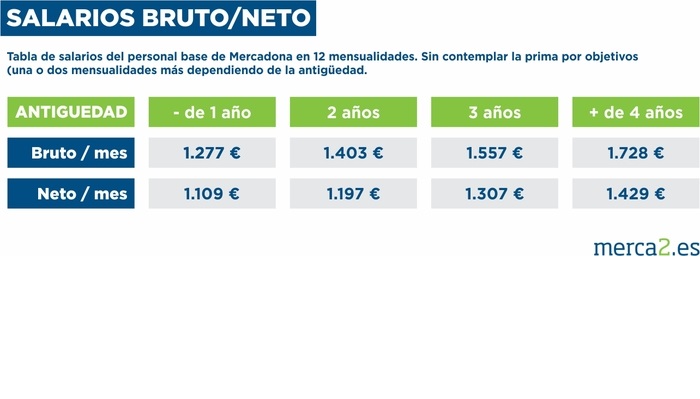 Si comparamos los salarios de los trabajadores, Mercadona es uno de los mejores lugares para trabajar en España dentro del sector de la alimentación. Los trabajadores comienzan con un salario base, el cual va subiendo a medida que acumulan antigüedad. Al final, en 4 años pueden estar ganando un buen pico, siempre comparándolo con otros supermercados.
