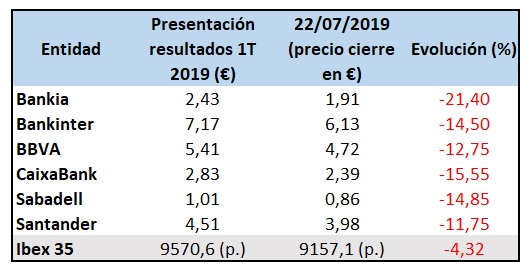 Desde el cierre de marzo hasta el de junio pocas alegrías han tenido los bancos españoles. La política de tipos del Banco Central Europeo (BCE), los avisos del Banco de España (BdE) sobre su baja rentabilidad, los problemas de reputación y las previsiones de una desaceleración económica global no auguran un horizonte muy soleado para las entidades cotizadas de nuestro país.