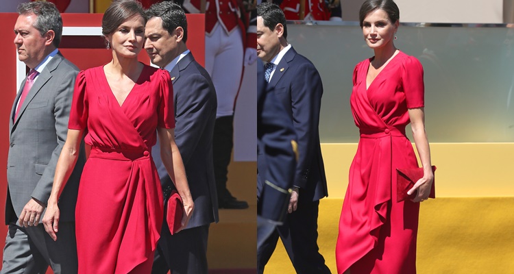 De nuevo de rojo, su color favorito, Letizia triunfó en el desfile de las Fuerzas Armadas en Sevilla. Este vestido rojo cruzado resalta las curvas y es de una marca española: Cherubina.