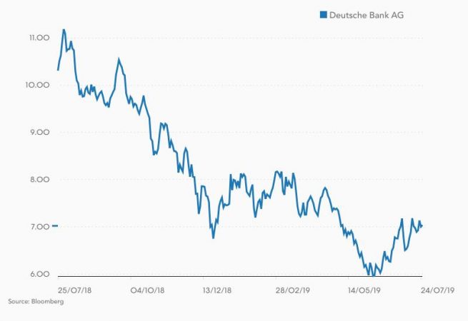 Quitar el zoom del cortoplacismo en la cotización de Deutsche Bank es suficiente para ver en qué situación se encuentra el banco. En 2015 cotizaba en niveles de 32 euros, en 2017 bajó a los 19 euros y en 2019 tocó suelo en 5,97 euros. Una depreciación del 81% o del 68%, depende de dónde fije la fecha para comparar con respecto al presente. En cualquier caso, algo iba mal.