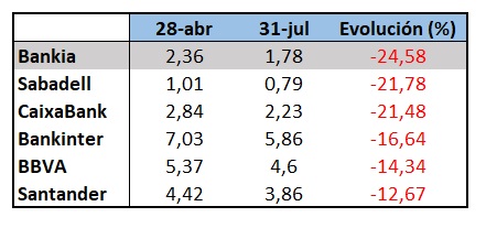 La primera reacción a la victoria del PSOE fue una subida del 3,39% el lunes 29 de abril. A partir de ese momento, la cotización de Bankia ha mostrado una tendencia bajista. Pese a la tímida recuperación en la primera quincena de julio, los títulos han vuelto a la senda de las caídas.
