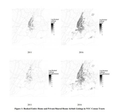 Por ello, otros estudios más geolocalizados, que llegan a unas conclusiones similares, ayudan más a identificar el efecto, su focalización y su posterior evolución. Uno de los problemas más acuciantes que podría llegar a ciudades como Madrid o Barcelona es el de que dicho efecto, que ya parece confirmado, podría extenderse de las zonas menos céntricas a otros barrios menos pudientes, alterando así también sus precios al alza y aumentando el efecto expulsión a un rango mayor. En concreto, dicho paper (‘Airbnb Usage Across New York City Neighborhoods: Geographic Patterns and Regulatory Implications’) explicaba que los listados de pisos de la plataforma entre 2011 y 2016 se habían dispersado geográficamente hasta barrios con rentas modestas.