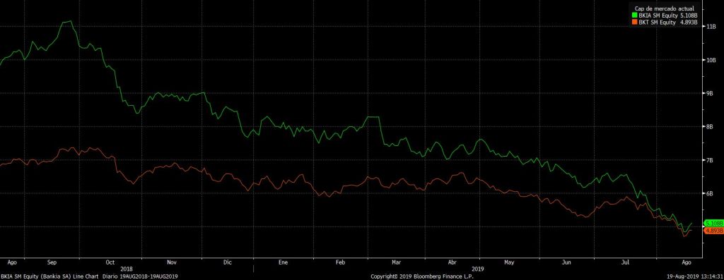 La diferencia ha disminuido en los últimos cuatro años, pero el mayor riesgo de adelantamiento llegó en julio. Las acciones de Bankia han caído con fuerza entre el 16 de julio (2,14 euros) hasta el 14 de agosto que tocaron suelo (1,57 euros). Un retroceso del 26,63% que ha puesto en riesgo su cuarto puesto en el ranking nacional de bancos por capitalización bursátil. Por el contrario, los títulos de Bankinter han disminuido su valor «solo» un 20,4% en ese periodo.