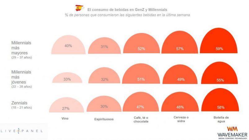 El estudio realizado por Wavemaker revela que en España apuntan que el consumo de alcohol entre las citadas generaciones es, en general, mucho mayor al global. Mientras que a nivel global sólo el 12% de los jóvenes entre 18 y 21 años confirma haber consumido vino la última semana, en España este porcentaje aumenta hasta el 27%. Igualmente ocurre con las bebidas espirituosas, que son consumidas por un 15% de los jóvenes entre 18 y 21 años a nivel global, pero por un 30% de los jóvenes españoles (el doble).
