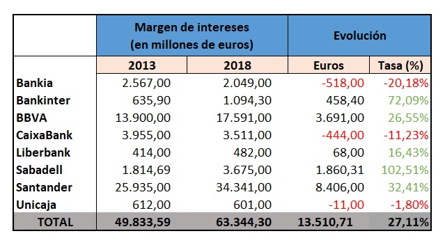 Los bancos españoles cotizados han acumulado un margen de intereses de 63.344 millones de euros a 31 de diciembre de 2018. Esta cifra representa un crecimiento del 27,11% con respecto al mismo día de 2013. Por entidades, las que más han crecido en tasa durante este periodo han sido Sabadell (+102,51%) y Bankinter (+72,09%). En el lado negativo, tres han bajado en este indicador: Bankia (-20,18%), CaixaBank (-11,23%) y Unicaja (-1,80%).