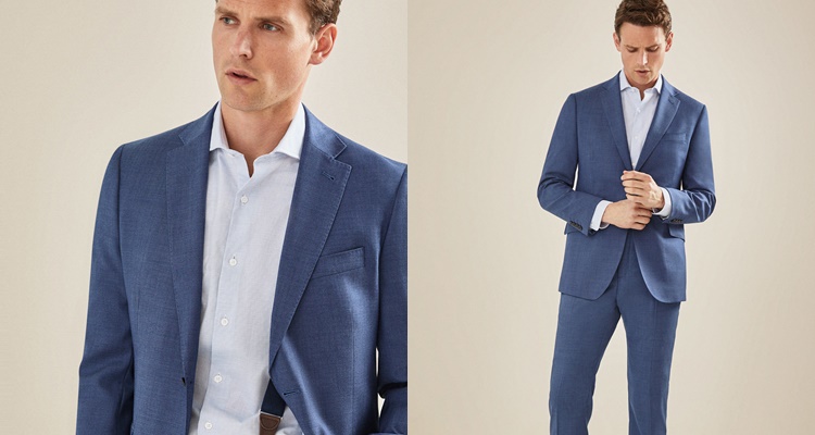 Cortefiel nos propone este traje estructurado en azul grisáceo 100% de lana. Actualmente la americana está rebajada a 69,99 euros y de puede combinar con el pantalón de traje.