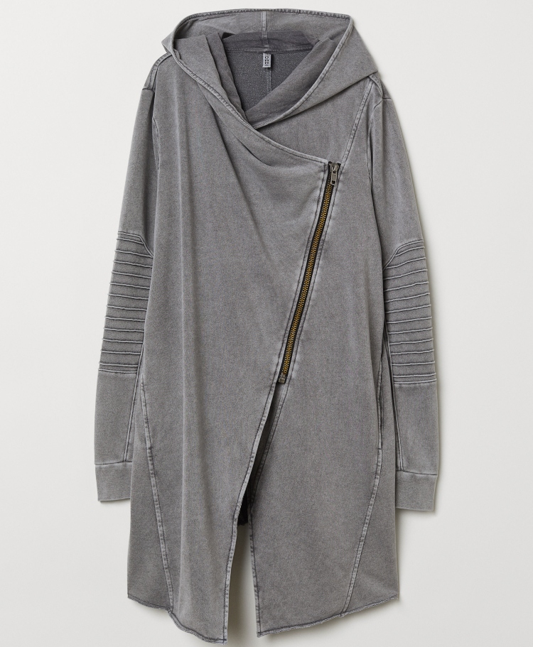 Este cardigan tiene un tejido sudadera ligero con capucha forrada. Es un modelo con cremallera diagonal delante, bolsillos al bies, mangas largas con pespuntes decorativos en los codos y puños en punto elástico de canalé. El bajo del cardigan está sin rematar para dar un estilo mucho más sport.