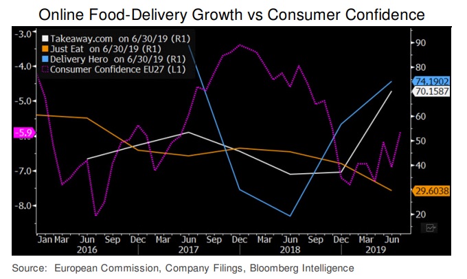 El crecimiento de los pedidos puede verse afectado por los temores de recesión, resaltados por una desaceleración en Alemania, de donde provendrá hasta la mitad de los ingresos de Takeaway.com en 2019, y un posible Brexit sin acuerdo en el mercado central de Reino Unido de Just Eat. Aunque el crecimiento de los ingresos parece no estar relacionado con los cambios en la confianza del consumidor, los analistas de Bloomberg tienen dudas de que ese sea el caso, ya que las principales compañías de entrega de comida nunca se han enfrentado una crisis económica desde sus salidas a Bolsa (Just Eat en 2014).